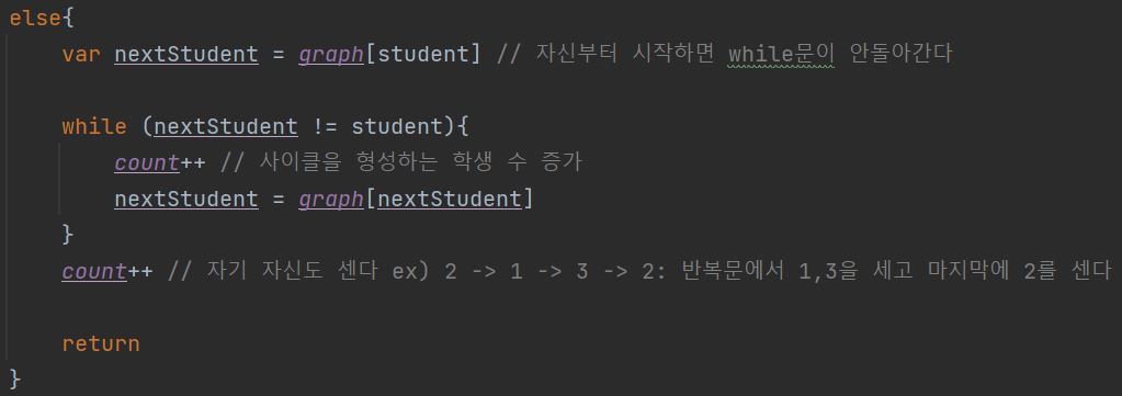 - 그렇지 않다면, 사이클을 형성하는 학생이므로, 그 학생의 다음 학생부터 자기 자신으로 되돌아올 때까지 반복문을 돌리면서 사이클을 형성하는 학생 카운트를 증가시킨다.