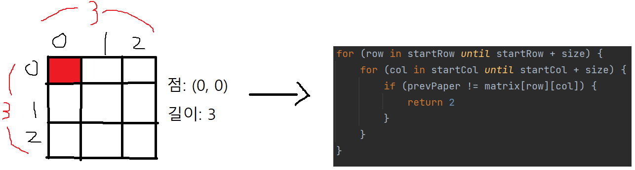 val result = hasSame(matrix, row, col, size) // 같은 숫자만 갖고 있으면 해당 숫자를, 아니면 2를 반환