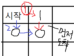 기본적인 BFS와는 문제와는 다른 점이 있는데요. 특정 위치에 최단거리로 가는 것이 아닌, 최소로 벽을 부수면서 간다는 것입니다. BFS의 특징은 가까운 순서대로 한번만 방문하면서 모든 위치를 방문할 수 있다는 것입니다. 하지만 이 문제에서 BFS를 그냥 사용하면, 이동 방향의 우선순위에 따라 벽을 더 많이 부수는 경로가 특정 위치에 먼저 도착할 수 있습니다.