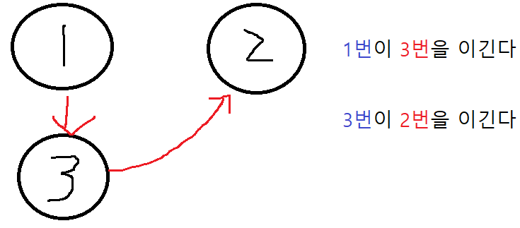 예를 들어, 1번이 3번을 이기고, 3번이 2번에게 이기면 3번의 입장만 고려했을 때, 3명 중 2명과의 관계를 알고 있으므로 순위가 확정된 것입니다.